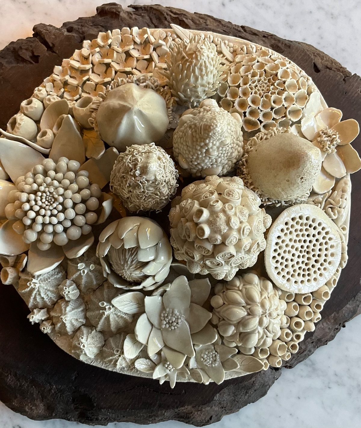 Stoneware paper clay ,clear glaze and mounted slab. on a jarrah slab.